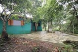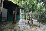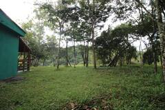 Amplo quintal com bosque, pátio com mesa para refeições ao ar livre.