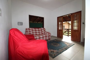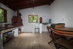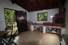 Casa com 02 quartos, sala com TV, wi-fi, cozinha com utensílios, fogão de lenha, fogão a gás, geladeira, banheiro, garagem coberta, churrasqueira, acomoda bem até 10 pessoas
